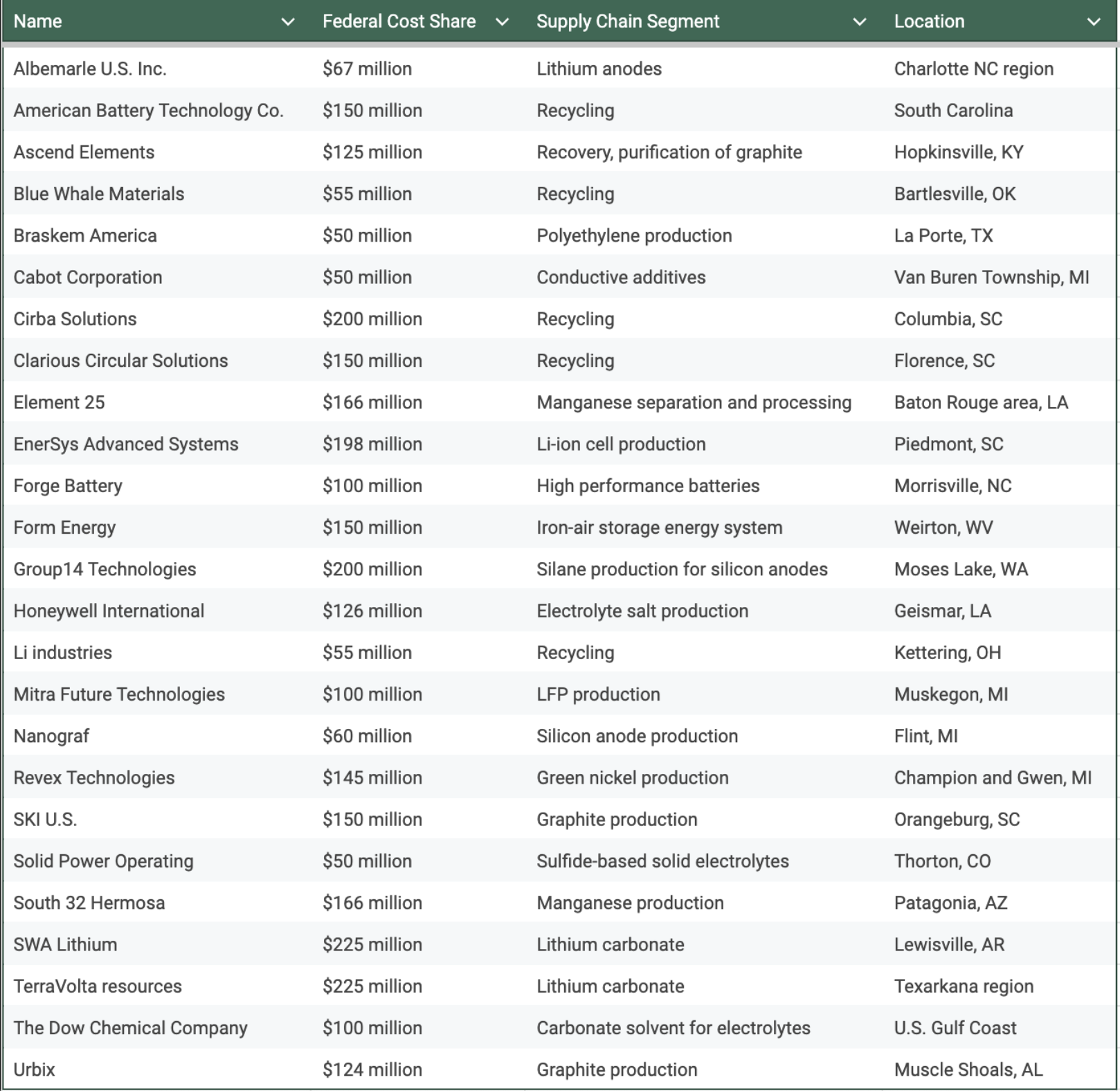 This tranche of funding went to startups across 14 states, but there were certain winners that will see the bulk of the expected 18,000 jobs to be created as a result of this funding. South Carolina companies secured the most funding, with five projects being awarded $850 million. For example, Cirba Solutions grabbed a $200 million bag to build, own, and operate a facility to process large-scale battery-grade salts to support the electric vehicle market.
